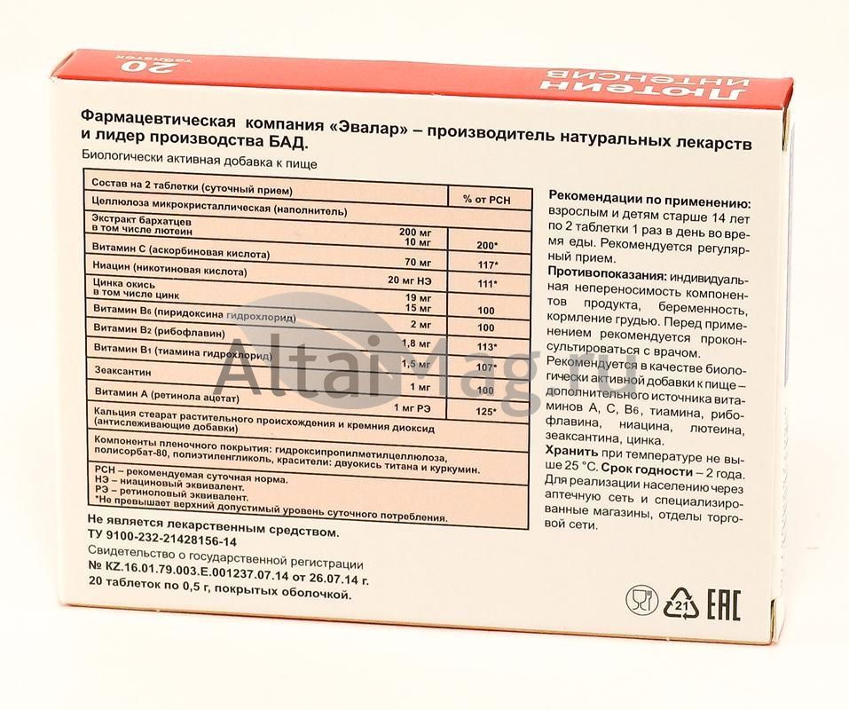 Содержание в 2-х таблетках (рекомендуемый прием в день) : лютеин 10 мг., зеаксантин 1 мг., витамин А 1 мг., витамин В1 1,5, витамин В2 1,8 мг., витамин В6 2,0 мг., витамин С 70,0 мг. (100\% суточной потребности), витамин PP 20,0 мг. (100\% суточной потребности), цинк 15 мг. (100\% суточной потребности).